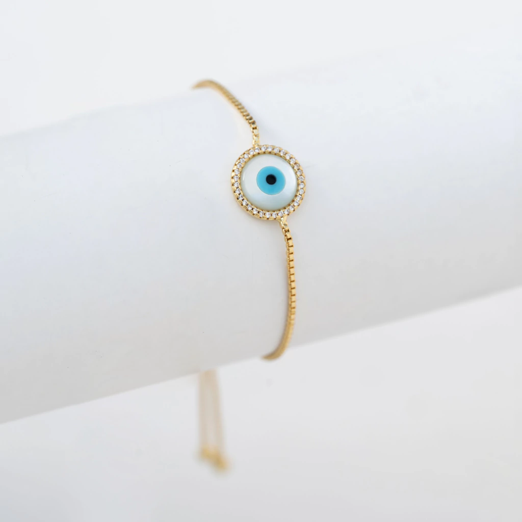 Bastet es una pulsera ajustable en dorado que centra su diseño en un ojo turco rodeado por un delicado halo de zirconias. Un amuleto luminoso que combina simbolismo y diseño.